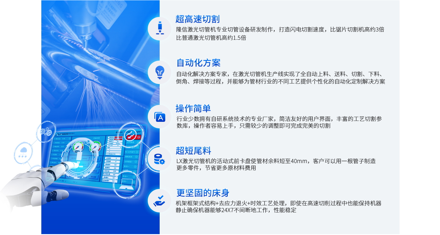 隆信激光走在激光切管技術前沿,不斷突破界限,參與起草樹立新的行業標準及重點領域應用的攻關 通過大量投入于研發創新,以優化性能、效率和可靠性 目前可切割的管徑涵蓋1mm-600mm